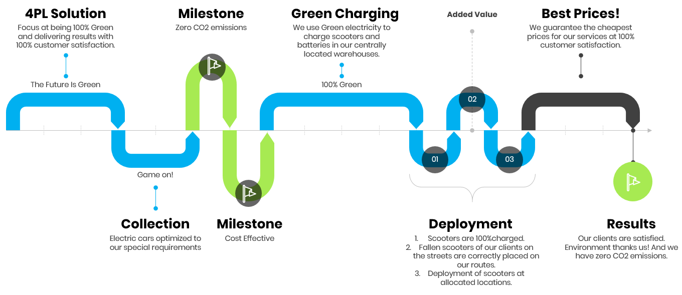 We provide a Zero emission operation for our partners through e-carts and e-vans for collection and deployment of scooters and bicycles. All scooters, bicycles as well as our service vehicles are charged with 100% renewable electricity.